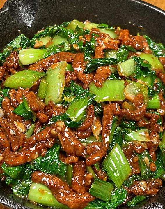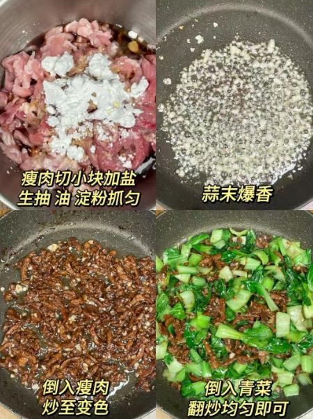 青菜鲜嫩清爽,肉丝入味滑嫩,荤素搭配鲜香可口,口感丰富不腻,简单快手,是下饭佳选。