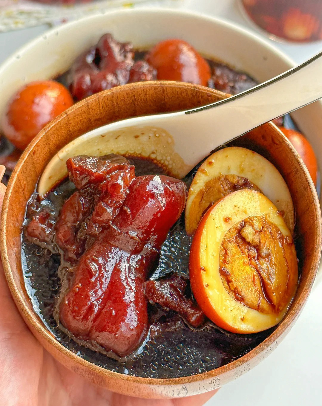 做好的猪脚姜放凉后,泡在汤汁里冷藏一晚,第二天再热着吃,味道更浓,鸡蛋和猪脚会更入味,这是广东人常说的 “越泡越香”。