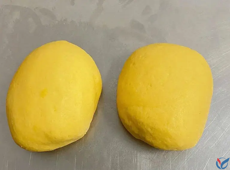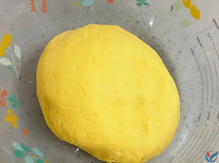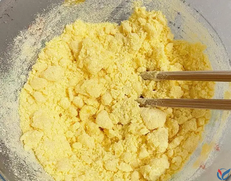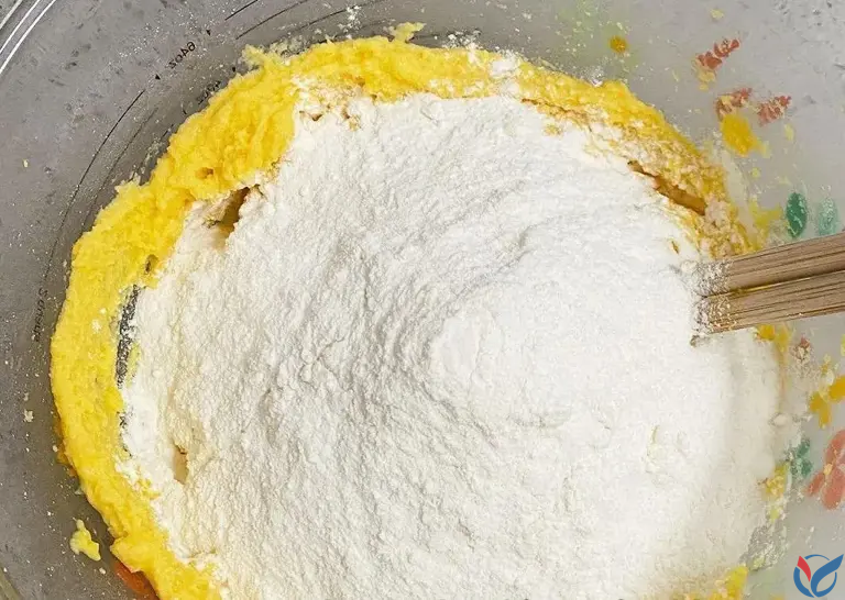 3、玉米面本身不容易形成筋性,我们再加入一些中筋面粉来帮助面团成团。
