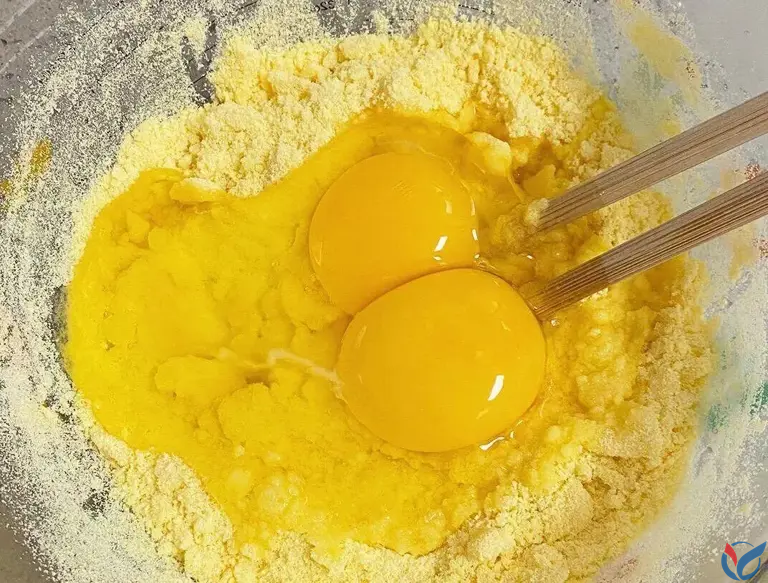 2、稍微晾一下,不烫手了再加2个鸡蛋,继续搅拌鸡蛋的加入,可以让玉米饼颜色更金黄好看。搅拌到颜色均匀食材完全混合均匀就可以。