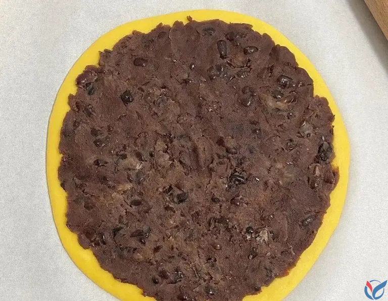5、在油纸上擀开第一块面团,成圆形。厚薄随自己喜好,但不要太薄,否则豆沙不易包住。在饼皮上均匀铺满红豆沙,注意在边缘的地方,留一点空隙,防止封口时溢出豆沙