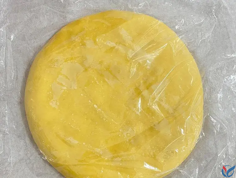 另外加糖和酵母,先搅拌成絮状,然后下手揉成一个成形,不粘手的柔软面团。盖上保鲜膜,放温暖处,发酵至两倍大。