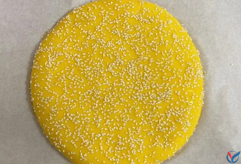 7、在饼皮的表面刷蛋液,撒白芝麻这样烤出来之后,外皮上色更漂亮,金灿灿的。