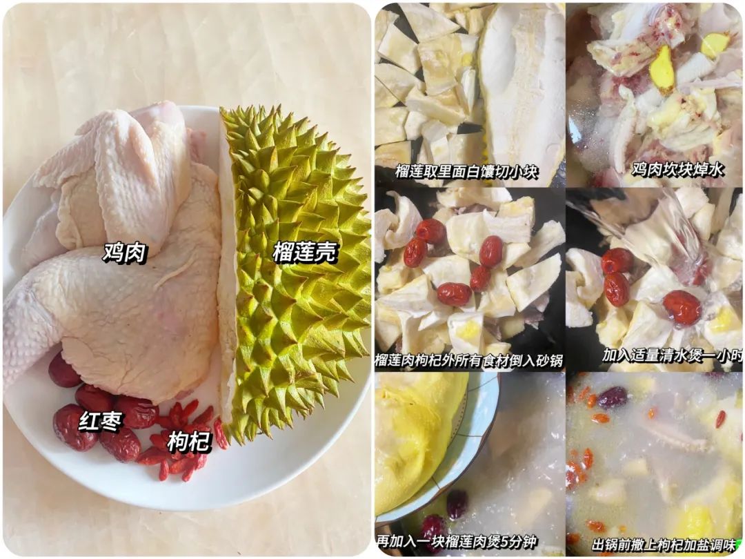 【食材】 榴莲壳白色部分 200 克、土鸡半只、红枣 5 颗、枸杞 10 克、生姜 3 片、盐少许