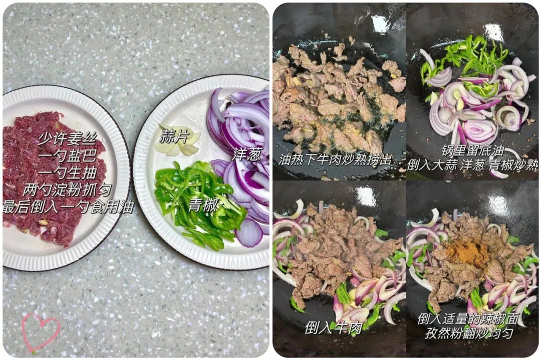 【食材】 牛里脊 200 克、洋葱半个、青椒 1 个、蒜 3 片、生抽 1 勺、淀粉 1 小勺、盐少许