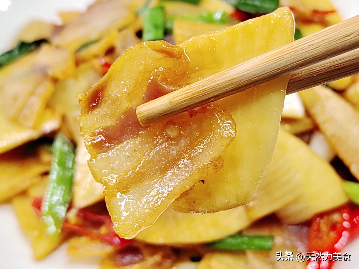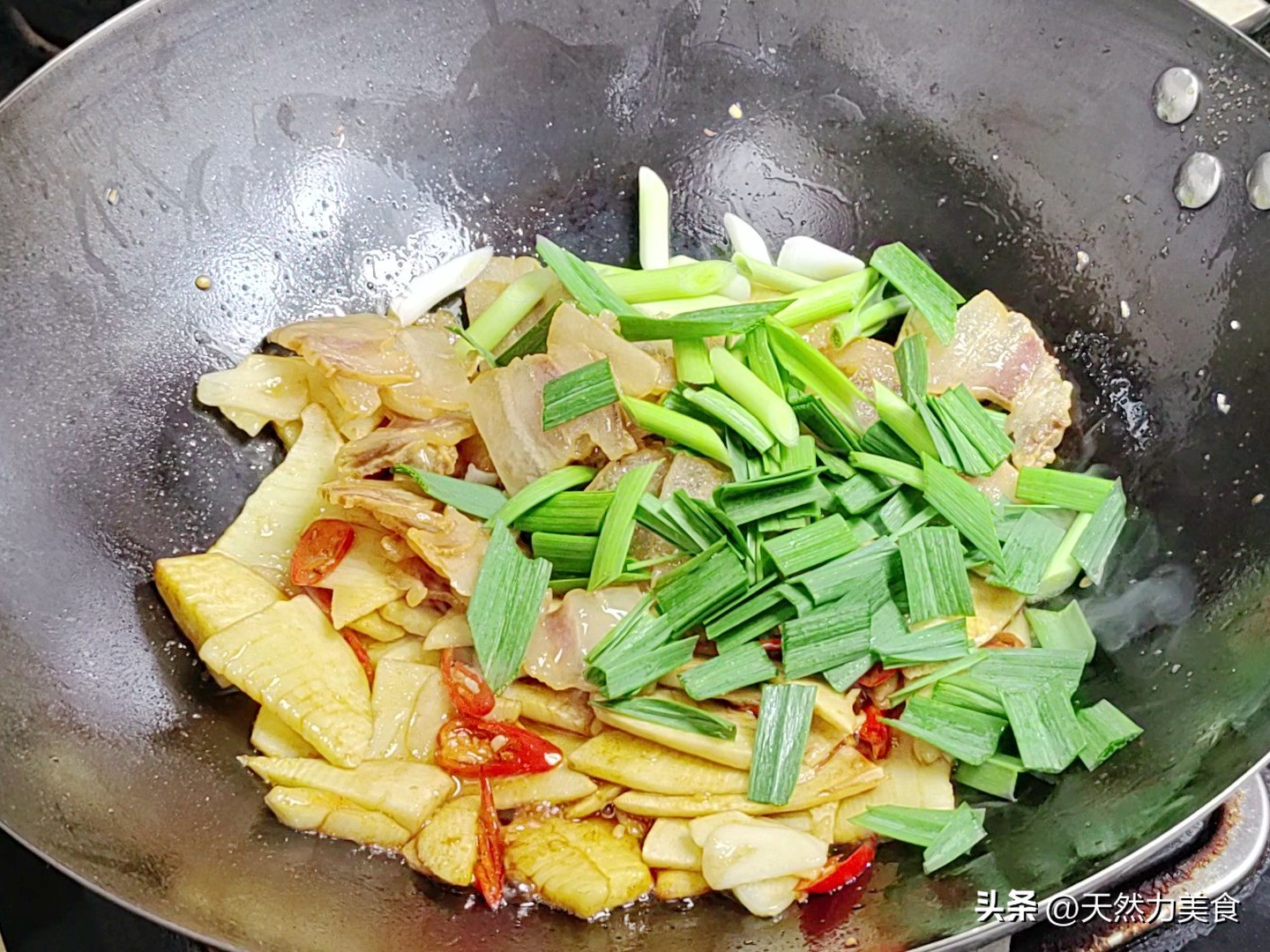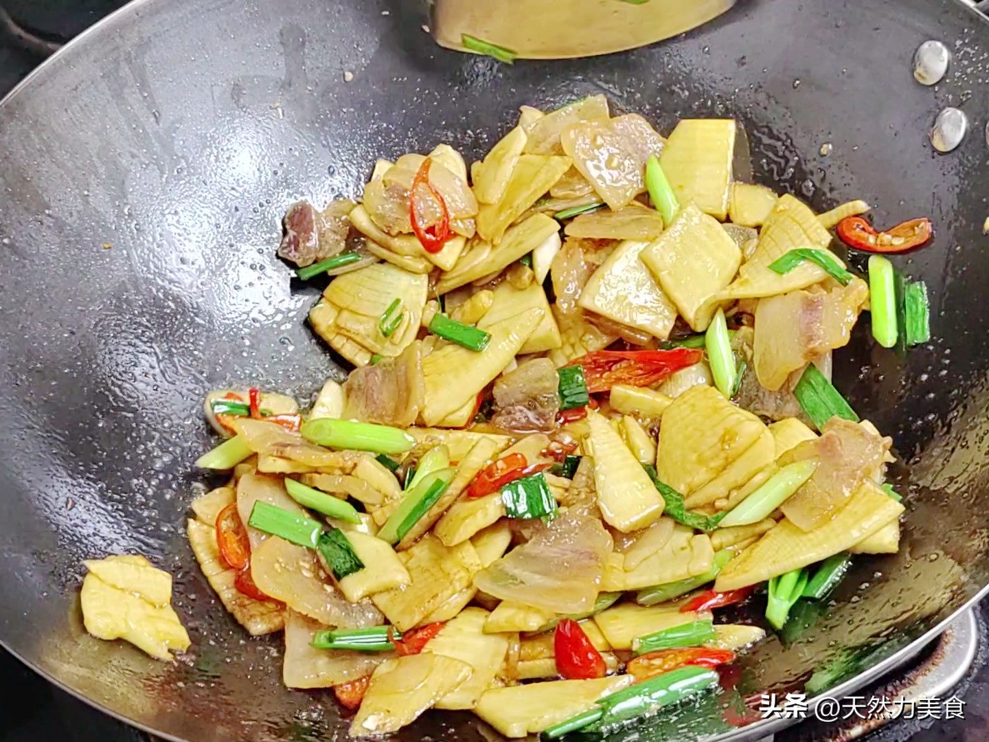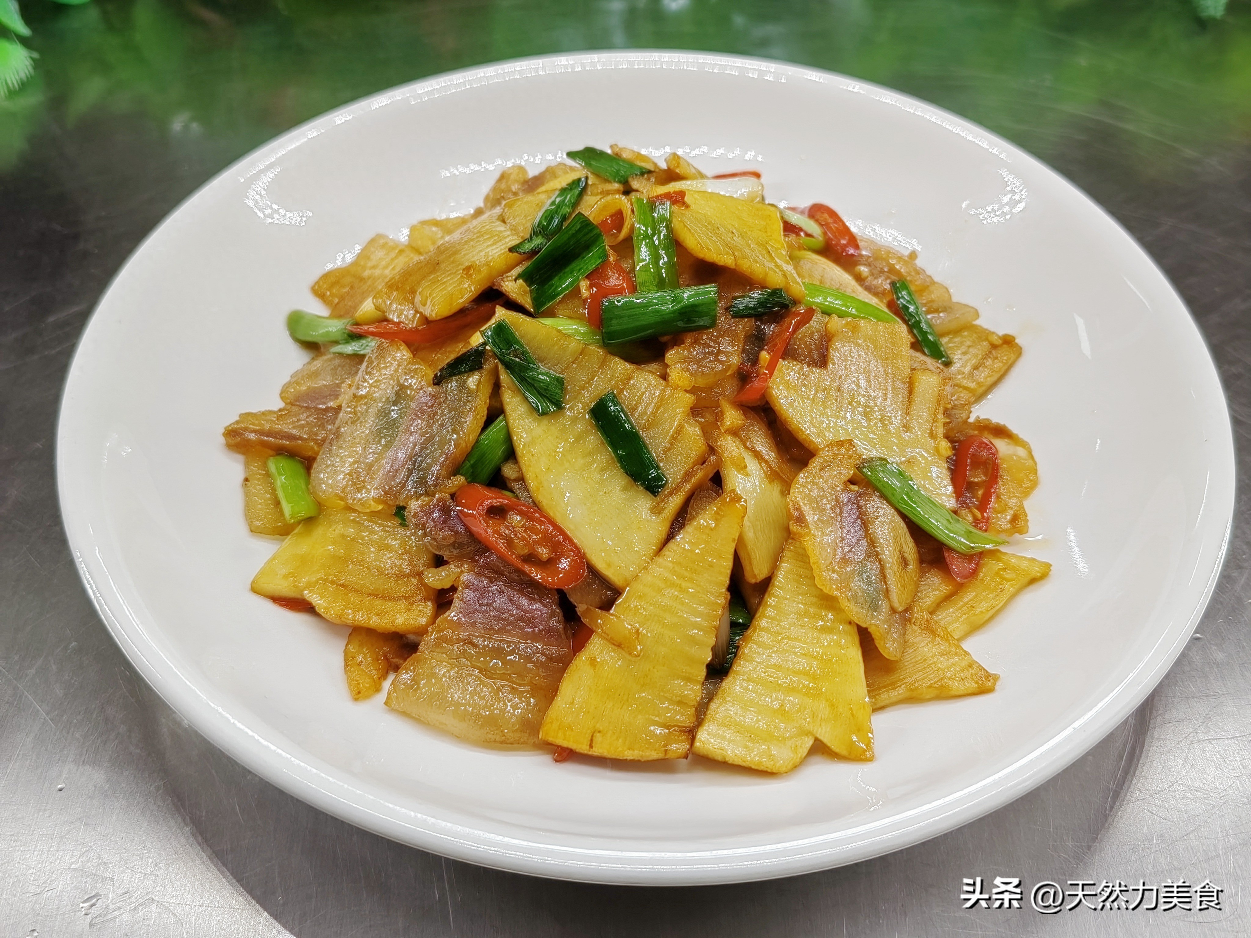 拿个盘子盛出来,你会发现笋片是脆亮的,腊肉是透明的,青蒜苗绿油油的,干辣椒红红的——光看着就开胃。