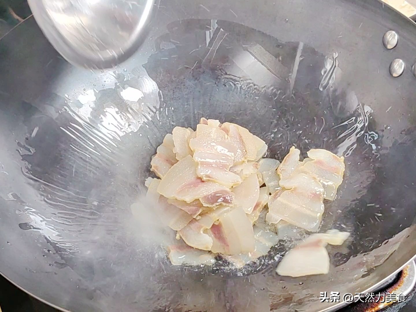然后把腊肉盛出来,锅里的油留着——那里面全是腊肉的香气,倒掉就亏大了。