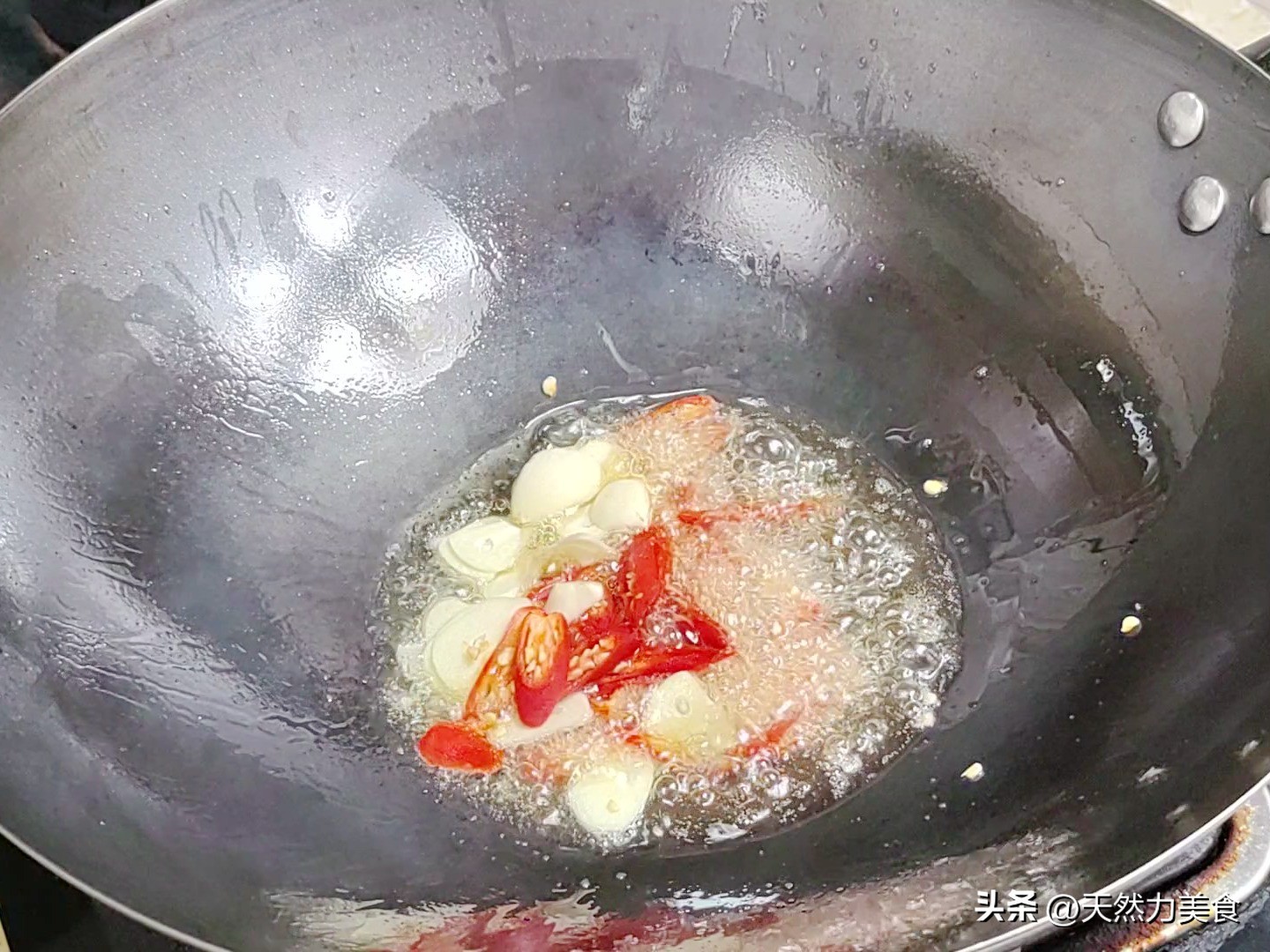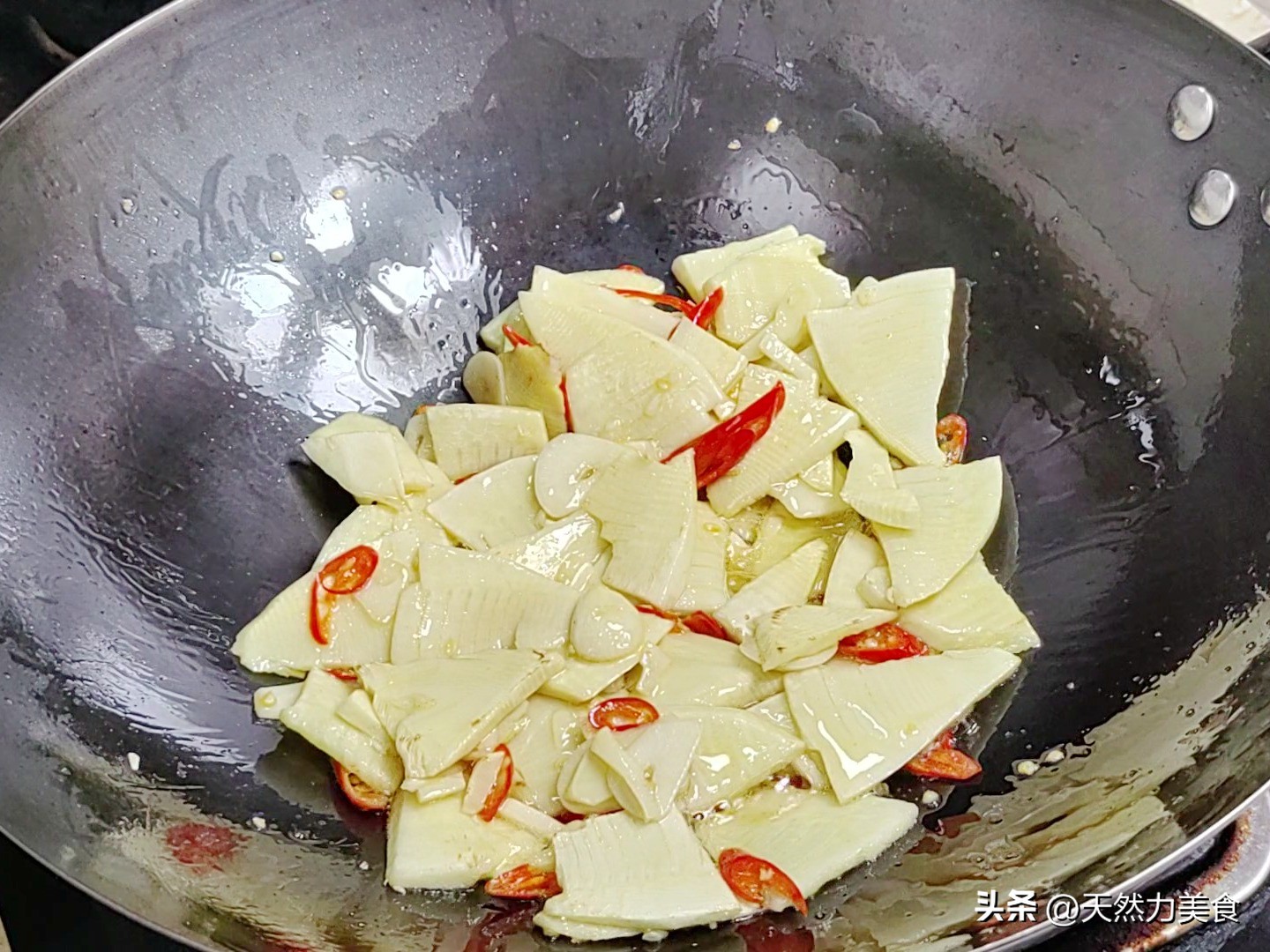 这时候把火开到最大。用锅里的底油,爆香姜丝、蒜末和干辣椒。大概十几秒,香味一窜上来,马上倒入焯好的笋片,快速翻炒。