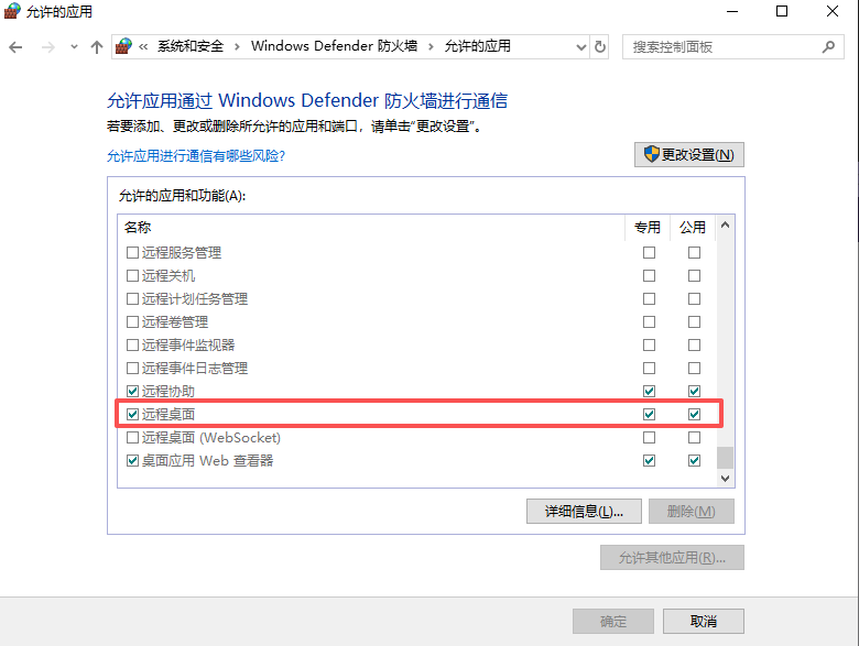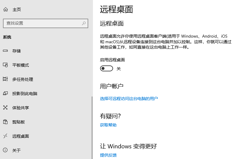 然后下拉至远程桌面选项,确保"远程桌面"处于允许状态,对于普通个人计算机,此选项在打开远程桌面开关时会被系统设置为自动允许;