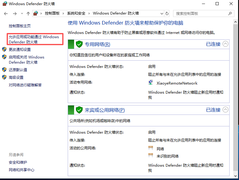 打开控制面板,进入"系统和安全 → Windows防火墙 → 允许应用通过防火墙”