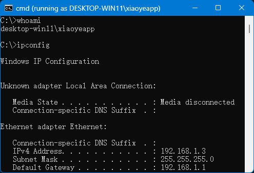 # 在被控电脑上打开命令提示符,执行whoami查看当前登录用户: # 显示结果:“计算机名用户名”,对于加入域的计算机,显示结果为“域名用户名” # 例如:desktop-win11xiaoyeapp
