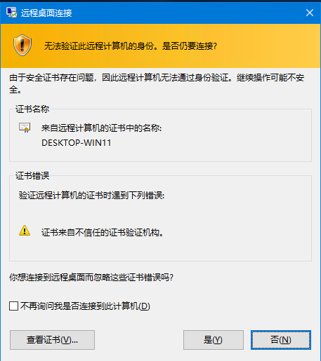 方法1. 勾选“不再询问此连接”, 下次连接时自动忽略警告;