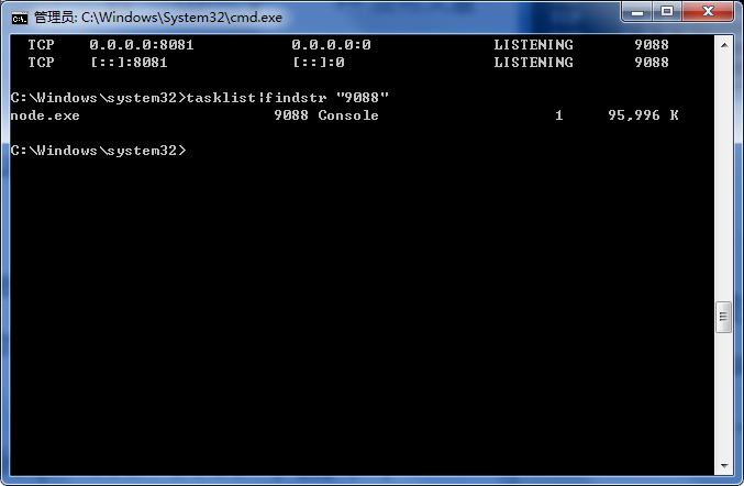 查看是哪个进程或者程序占用了 8081 端口,结果是:node.exe。
