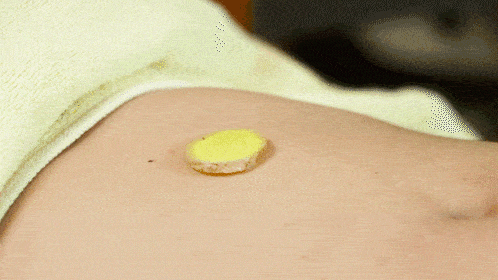 首先第一步,将生姜切成薄片,一般切成圆状即可,然后在姜片上戳几个可见的孔洞,第二步则在施灸者的艾灸部位撒一些半融的食盐,最后把姜片放上,将艾绒置于姜片上点燃即可。